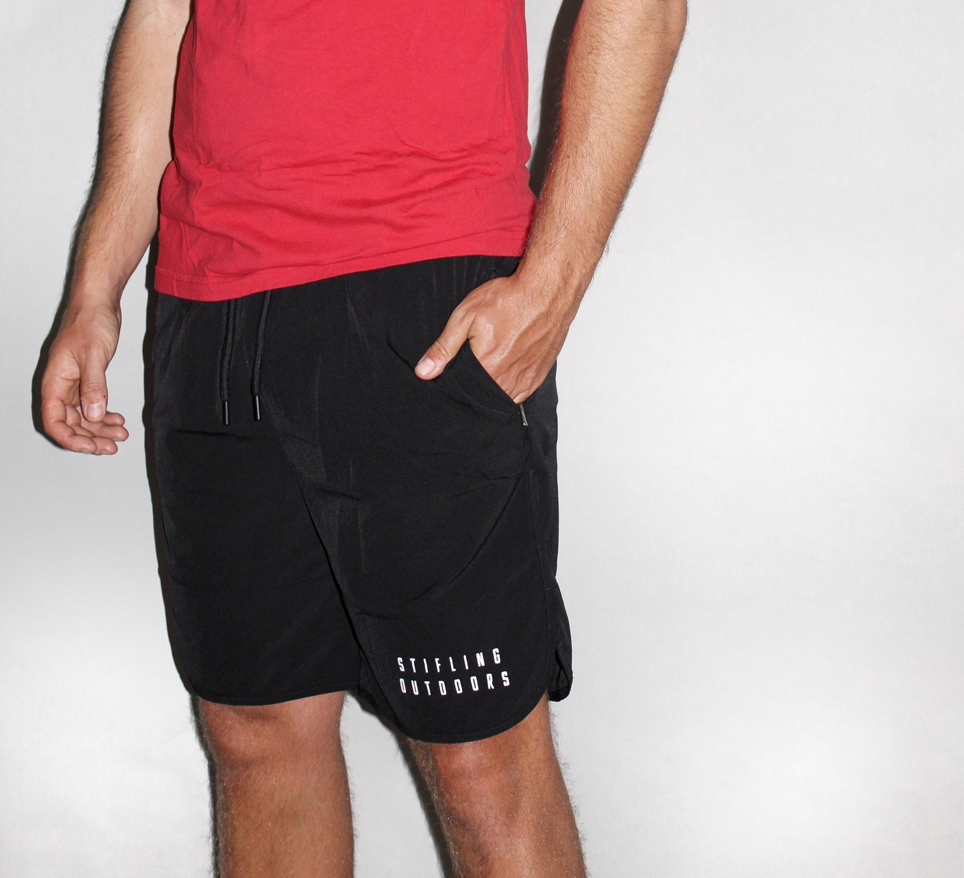 Designed for adventurers, Men's Charcoal Black Hiking Shorts provide optimum comfort and performance. The black shorts feature a white logo, have pocketing to keep belongings and essentials secure and adjustable drawstrings for a personalized fit. Crafted from a special nylon and spandex blend, they offer exceptional strength and flexibility for activities both indoors and out, and are highly moisture-wicking and quick-drying for durability in any outdoor environment. Take athleisure to the next level.