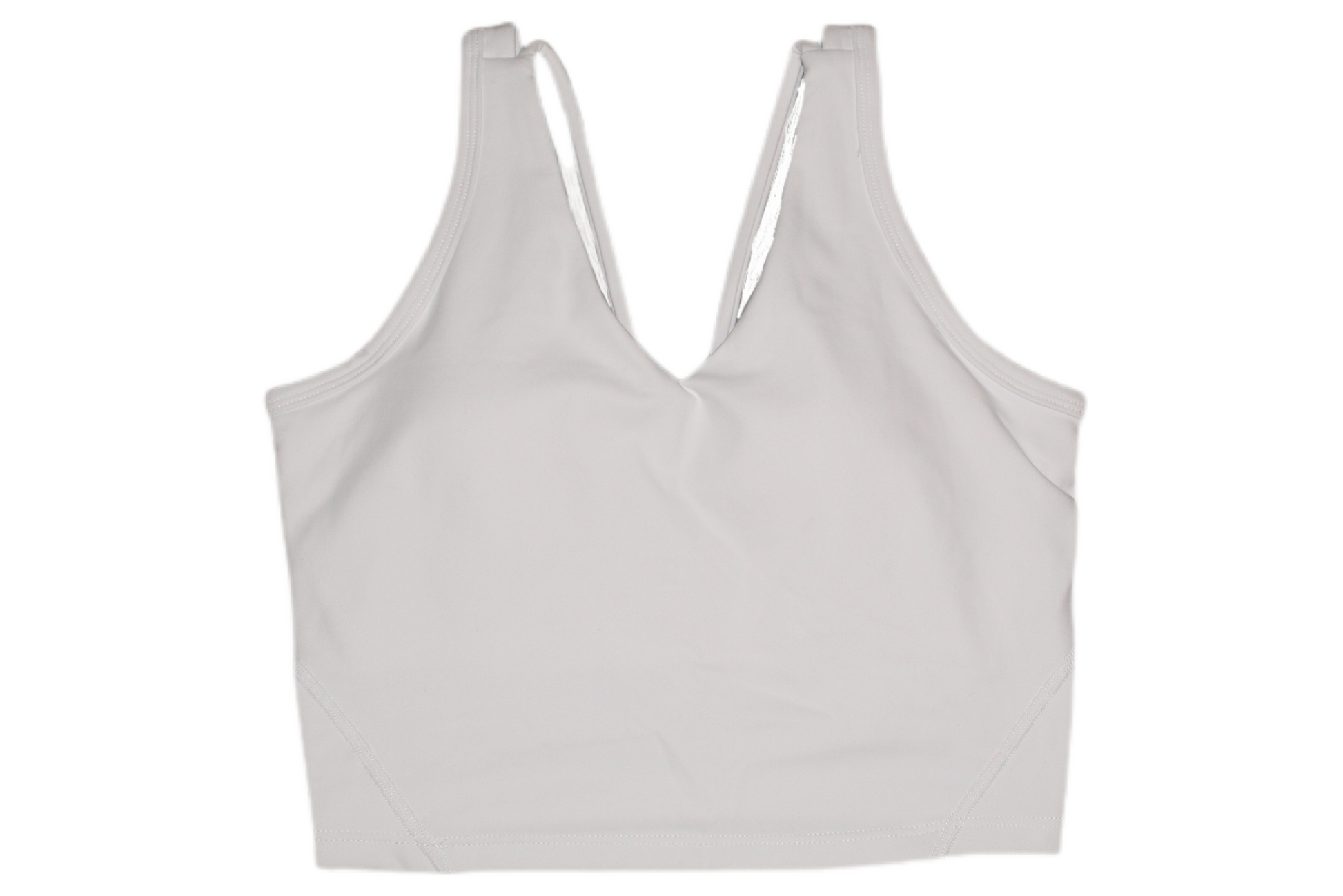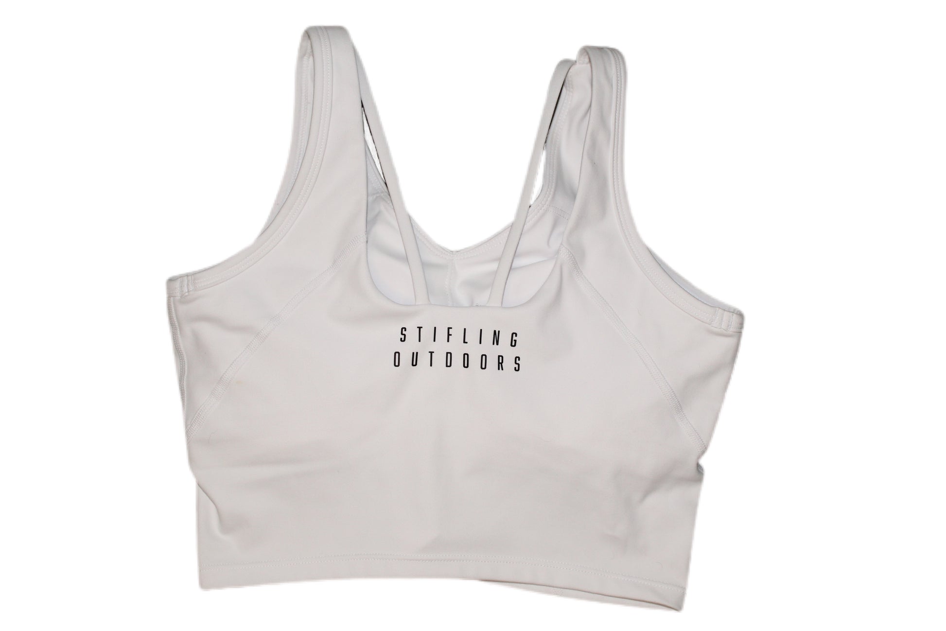 Shop for a women’s white cloud top with a built in bra. No underwire equals happiness. 3D logo on back in black. Two extra straps in the back for a sleek aesthetic look. Recommend sizing up. Very compressive