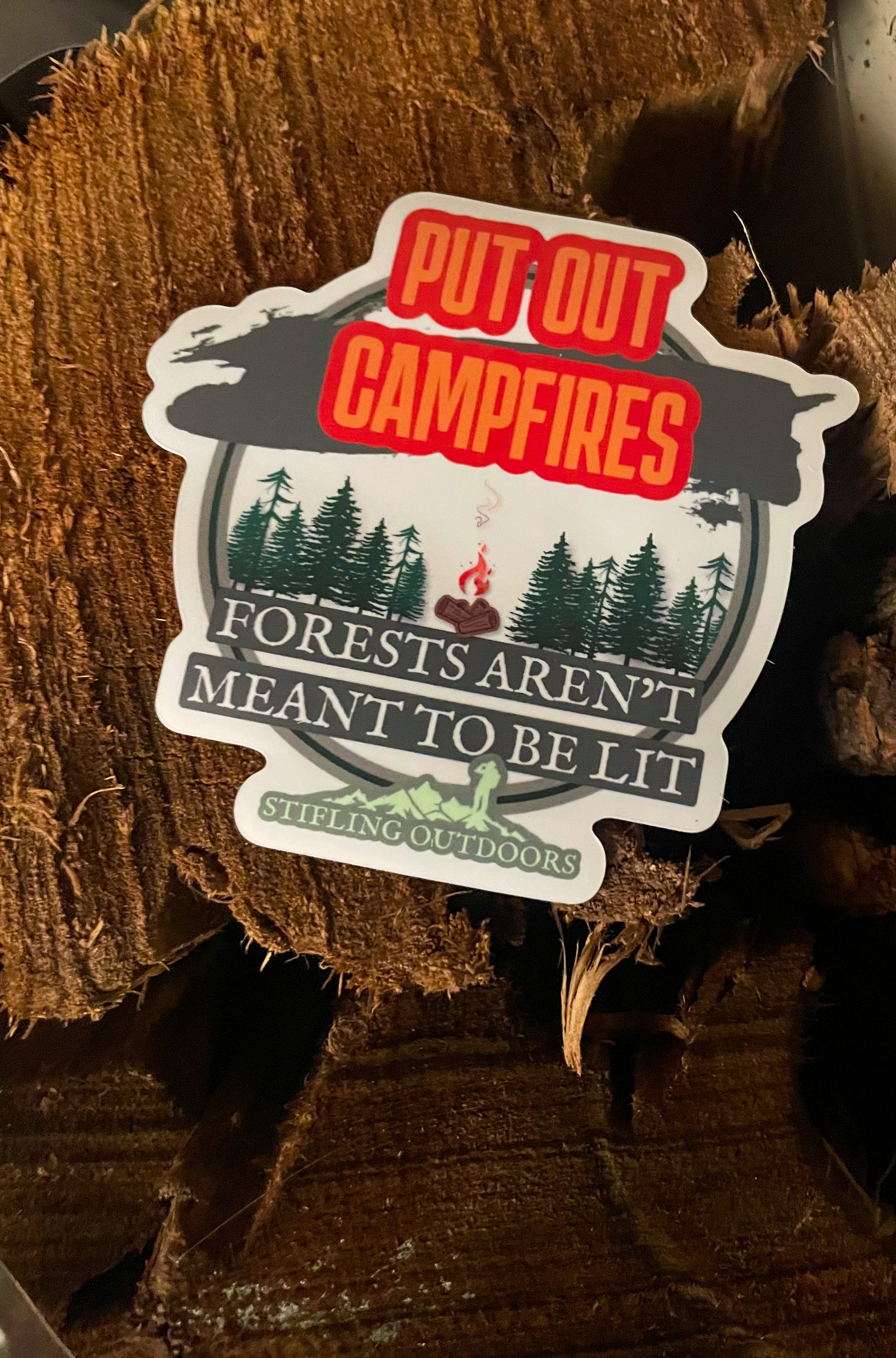 A waterproof sticker that says, “Forests aren’t meant to be lit” and “Put out campfires.”