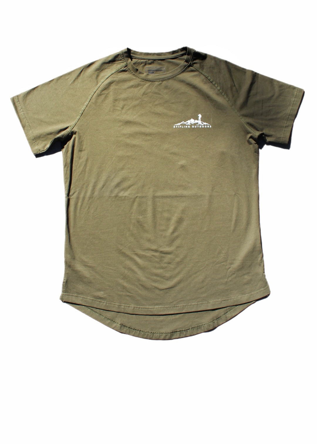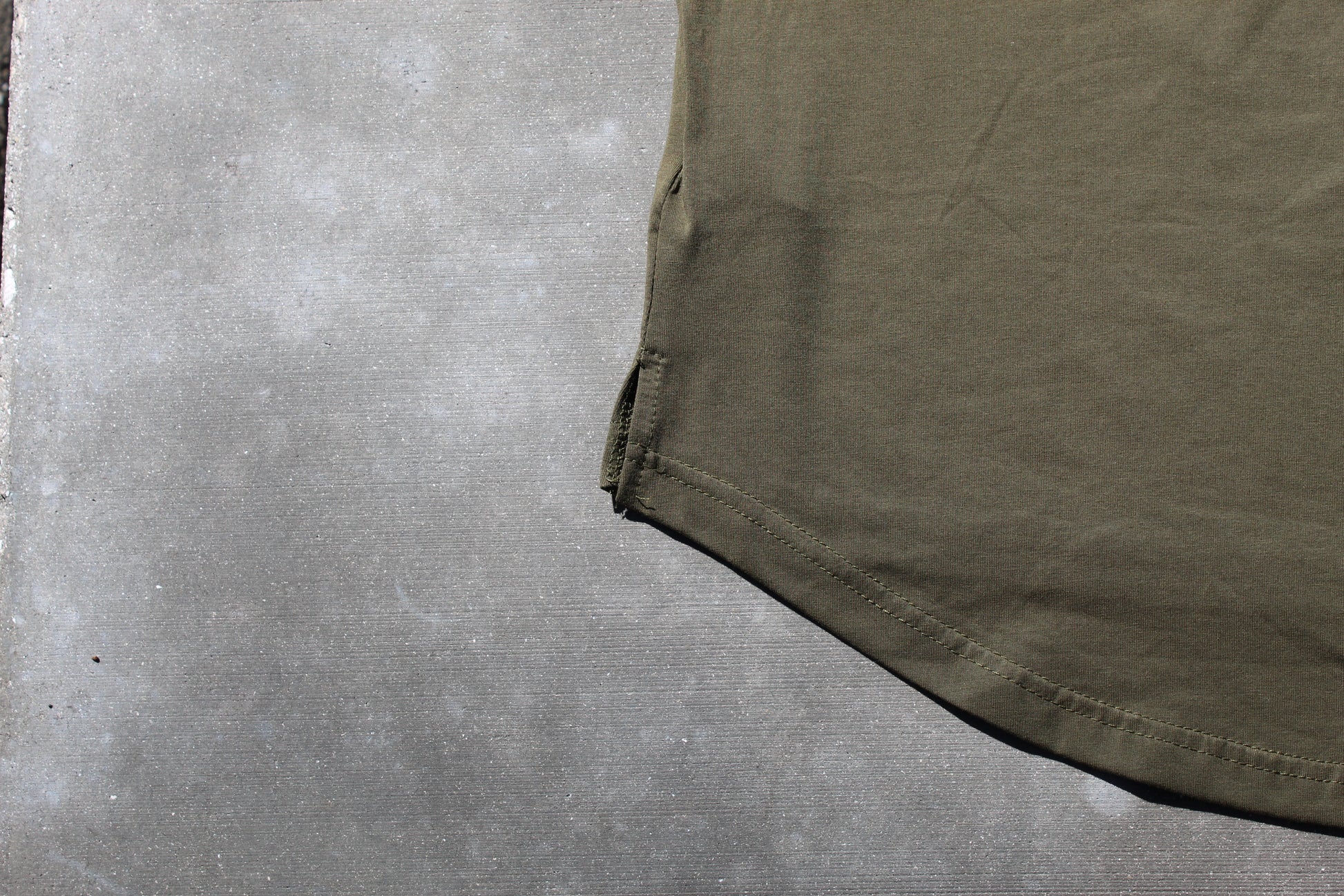 A olive green curved hemline T-shirt with fitted arm sleeves. This shirt is an athletic performance style with a bit of stretch.