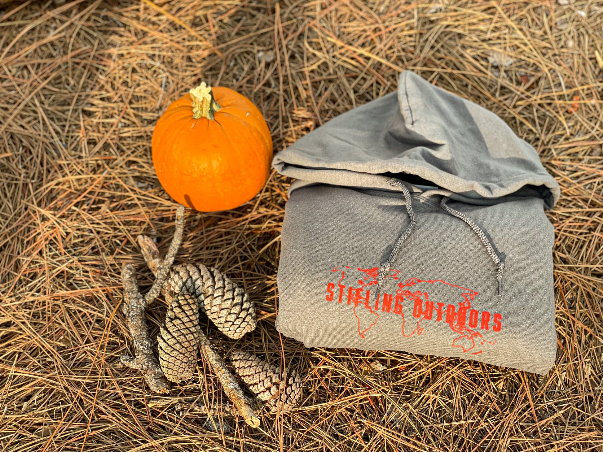 Shop for a charcoal grey mens hiking hoodie. This hoodie has a red Stifling Outdoors world logo on the front. Heavy Duty cotton/poly blend