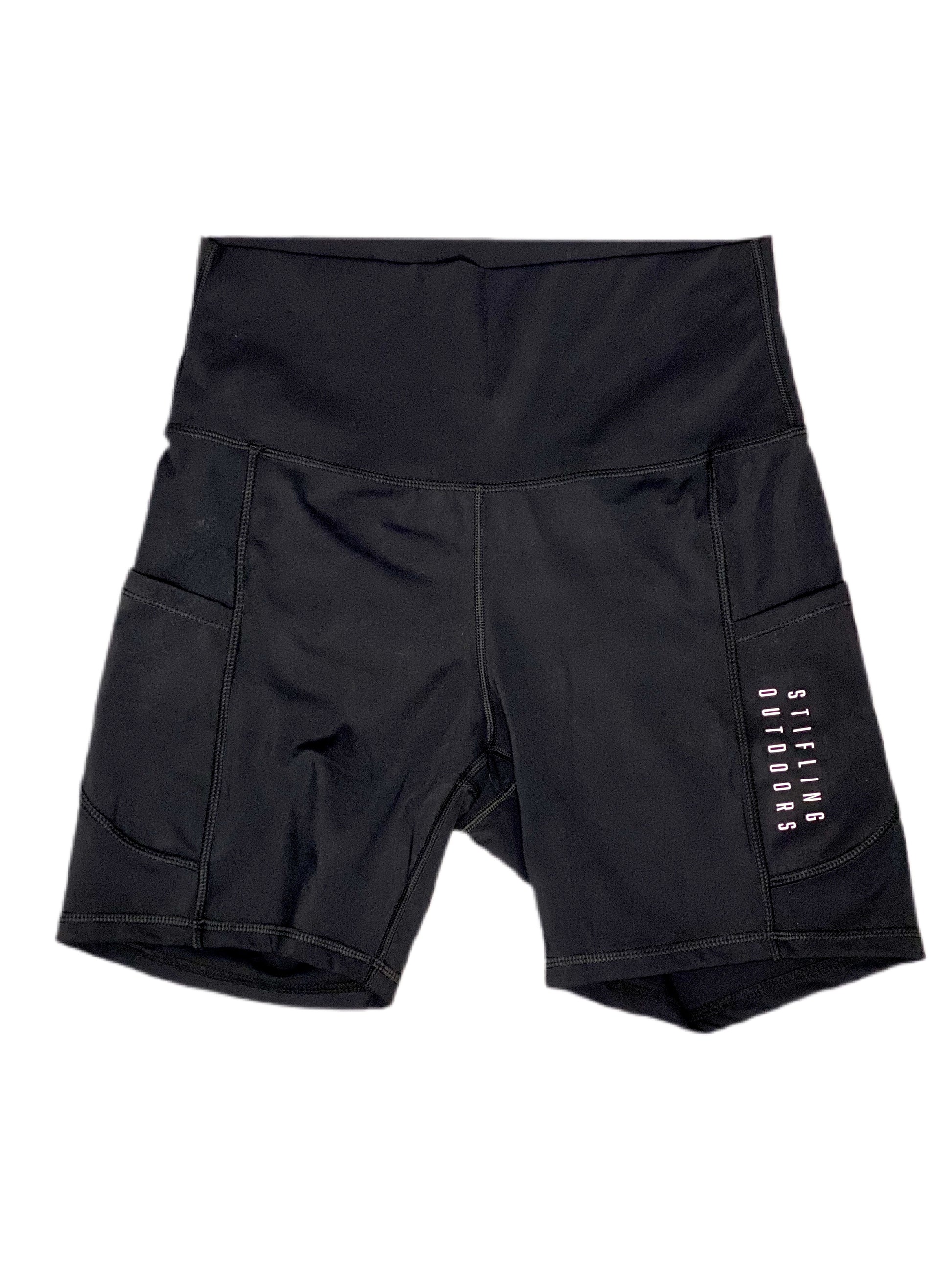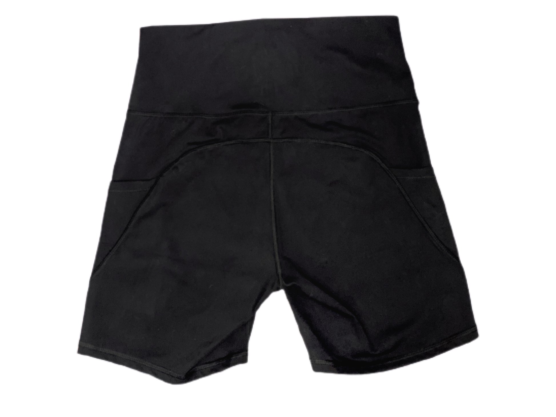 Shop for Womens Midnight black biker shorts with pockets on each side // 3D silicone logo on the left side in white // detailed stitching throughout// high-waisted tummy control