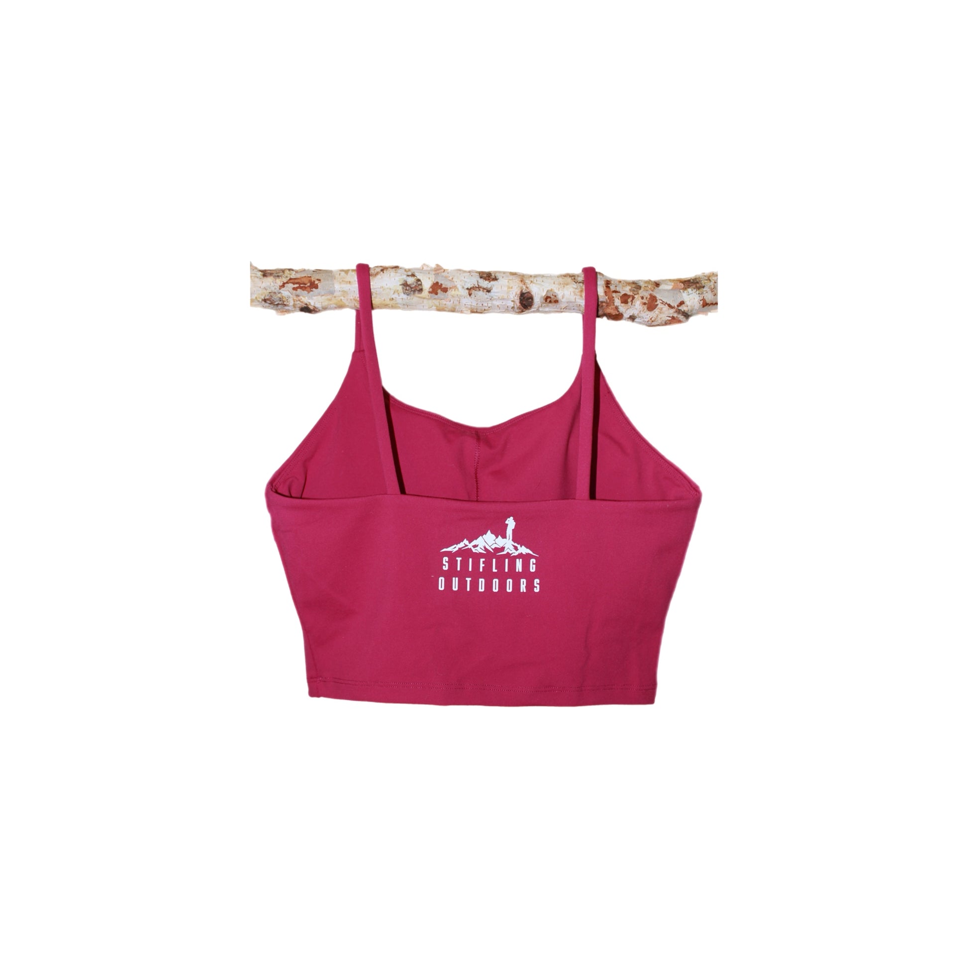 Find the ideal magenta-colored cami crop-top for engaging in outdoor activities. This top is tailored for hiking, biking, road-trips and running and comes with a built-in padded bra. Flaunt the stylish Mountain Logo on the back in white.