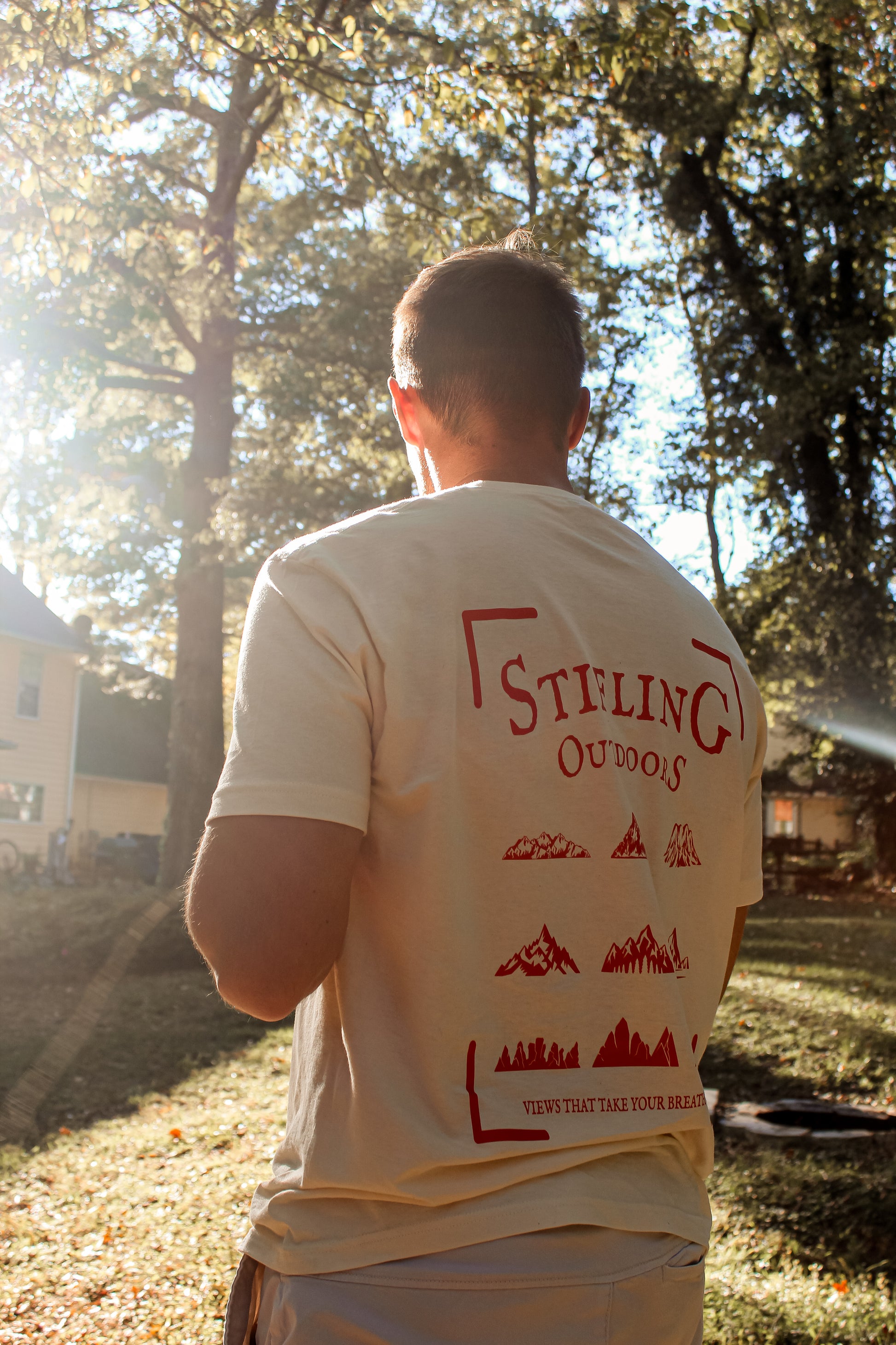 Experience the great outdoors in style with our Men’s Mountain T-Shirt! This creamy beige shirt features a bold red font with the phrase "views that take your breath away" alongside a stunning mountain design. Perfect for adventurers and nature-lovers alike!