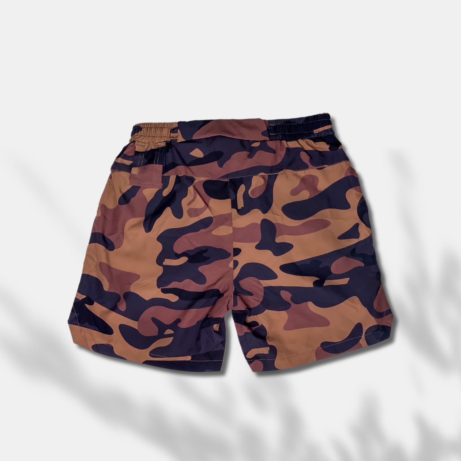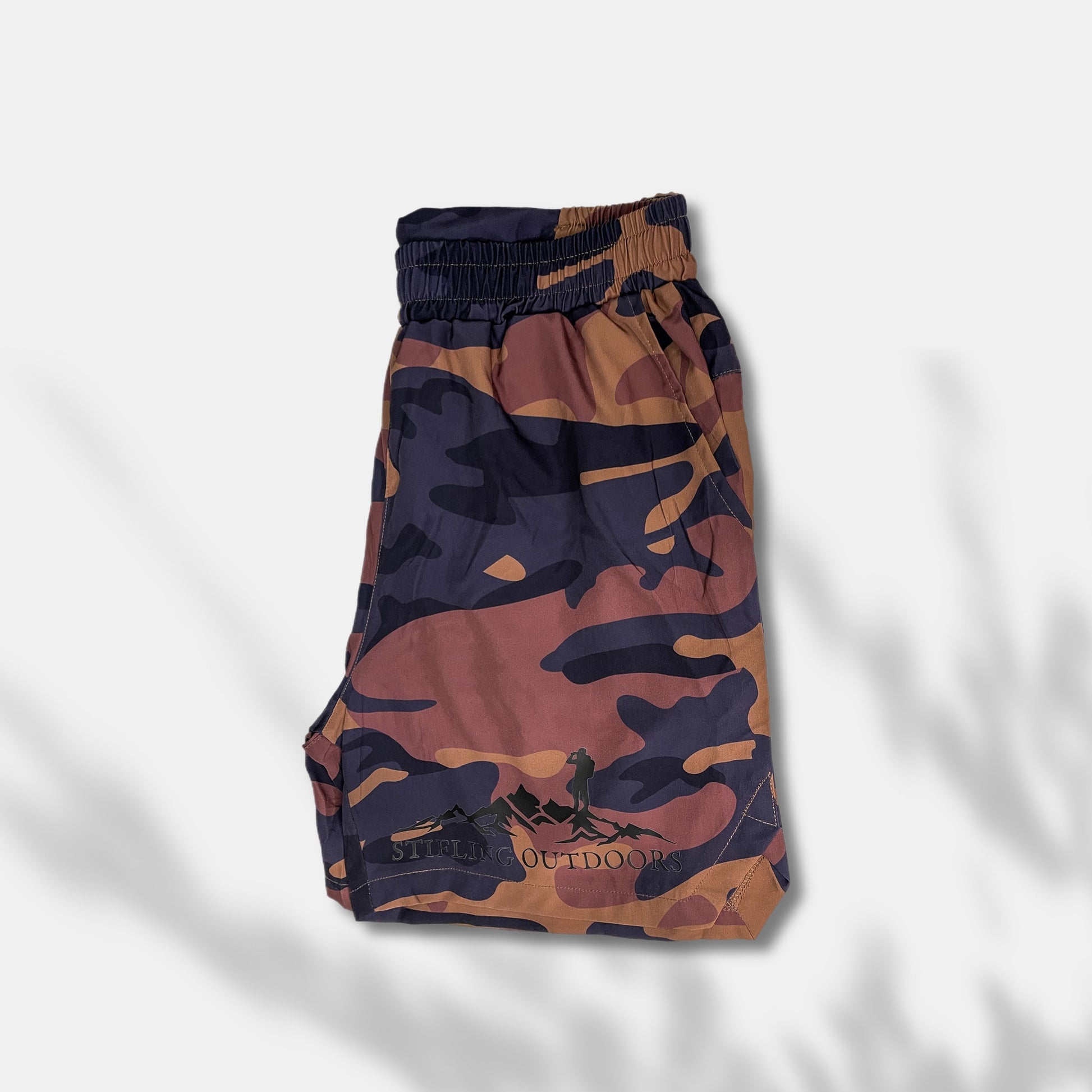 Men’s shorts in a camo pattern. These sit above the knee and have an angled opening on the side for all outdoor activities. They have a pocket on each side and are linerless. Quick drying.