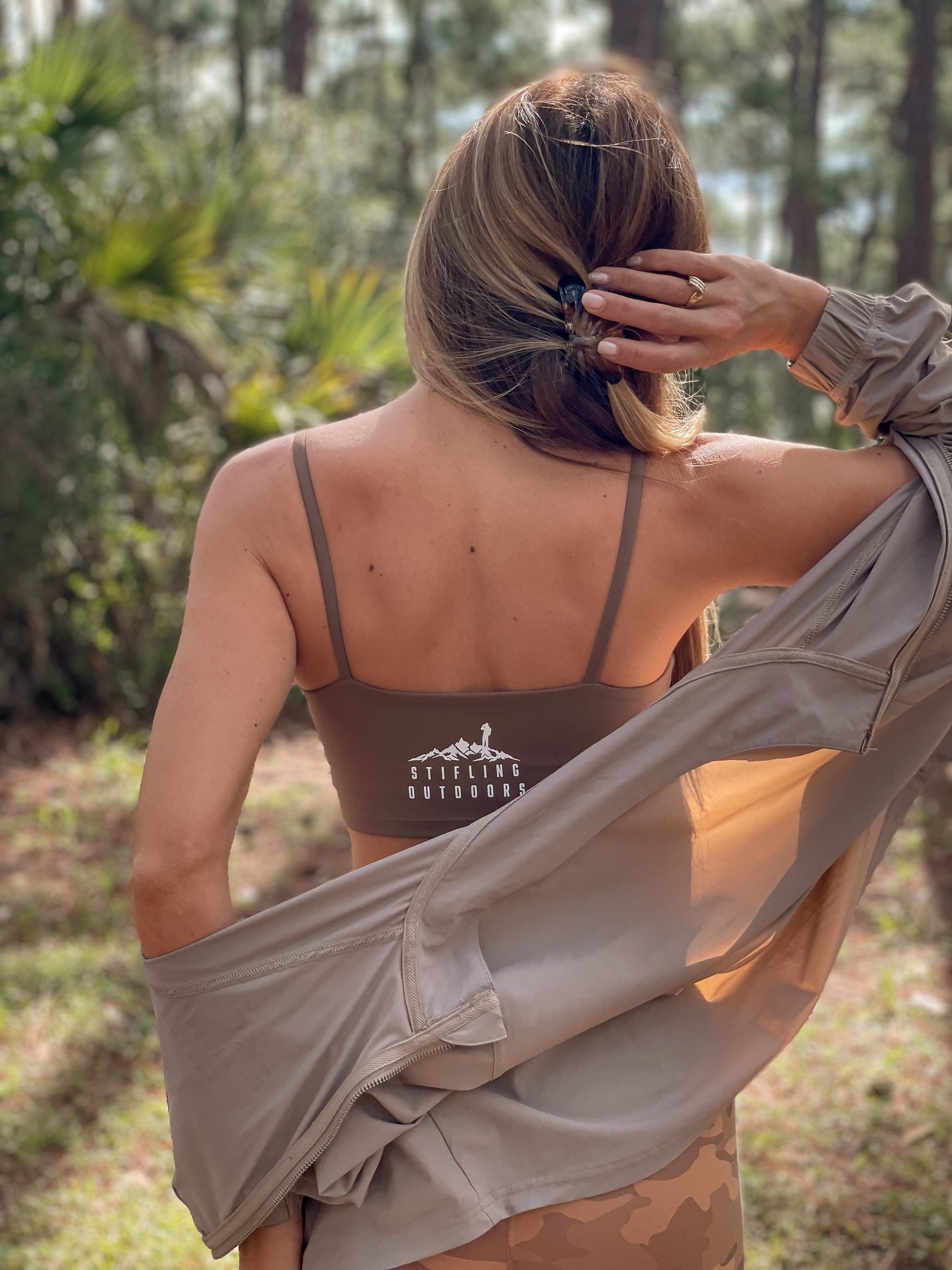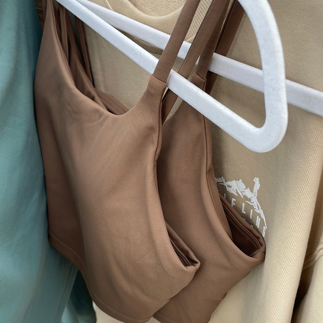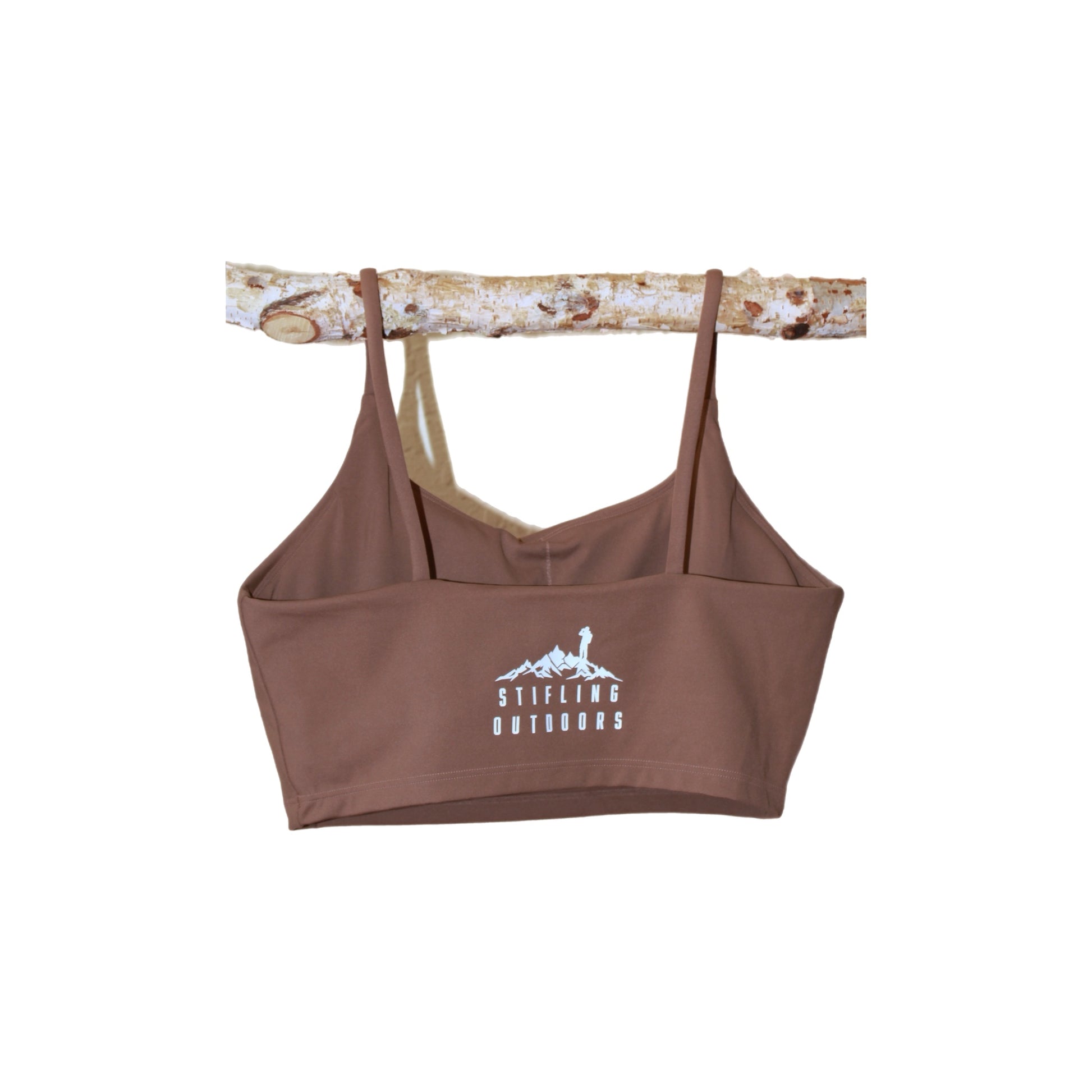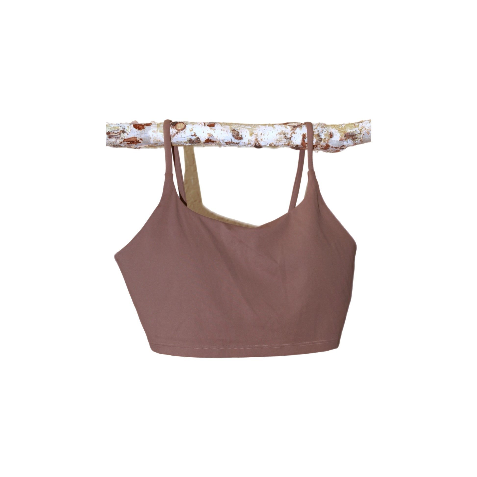 A mocha brown cami crop with a built in sports bra. White logo on the back. Buttery soft