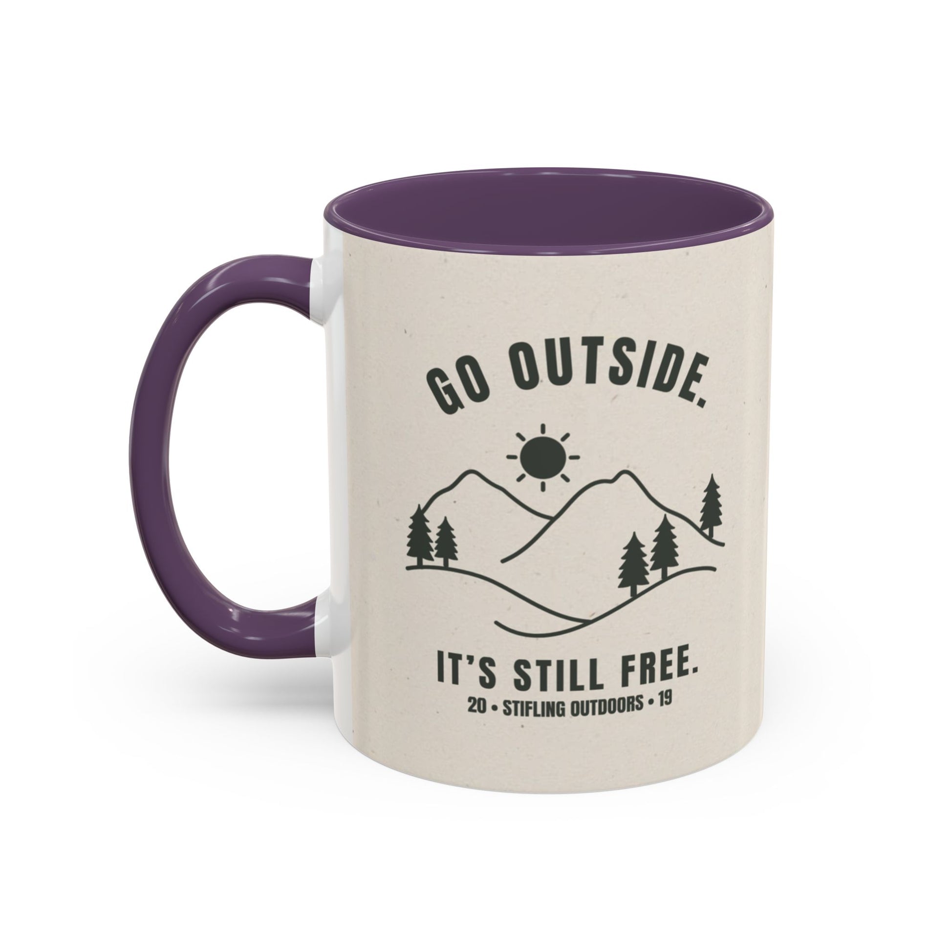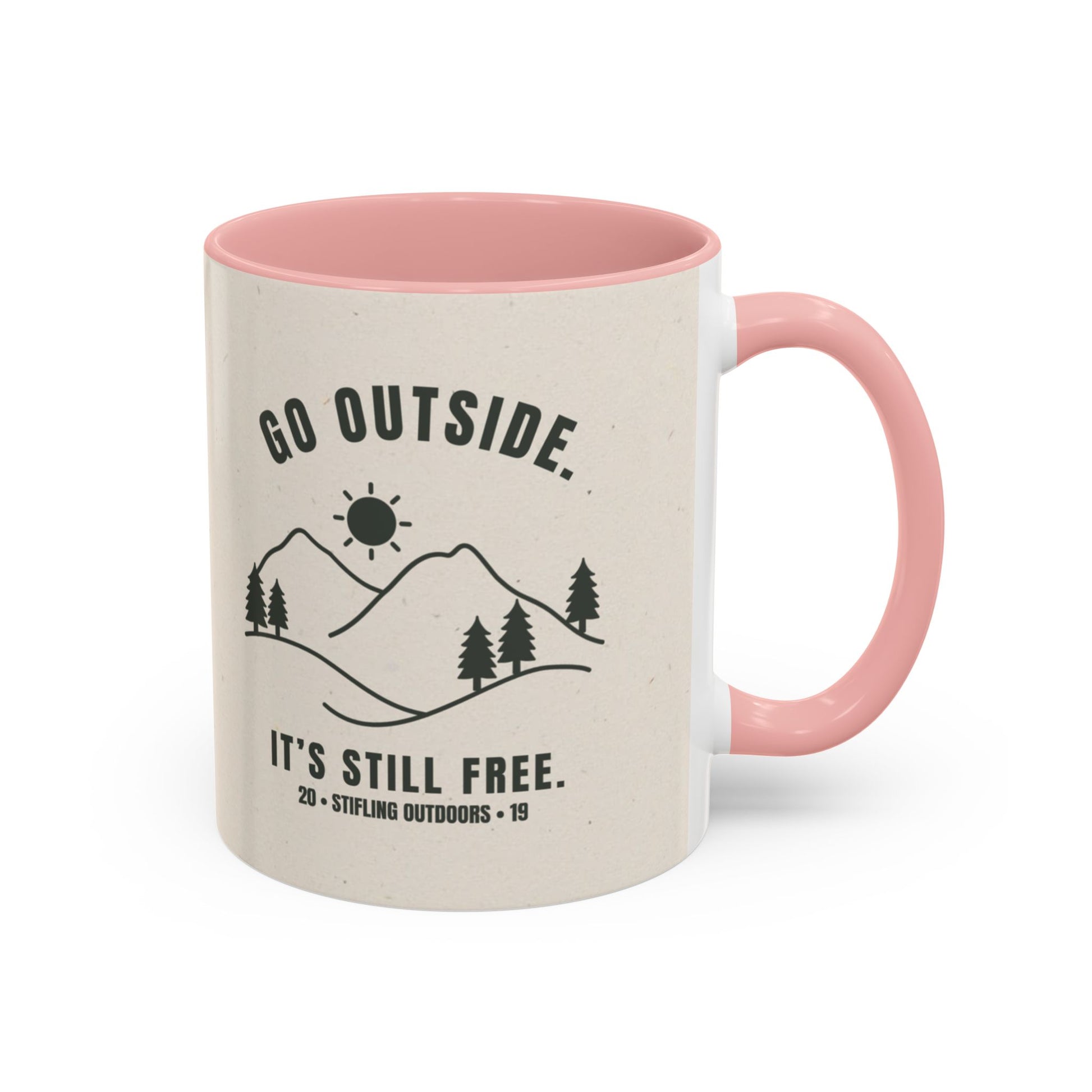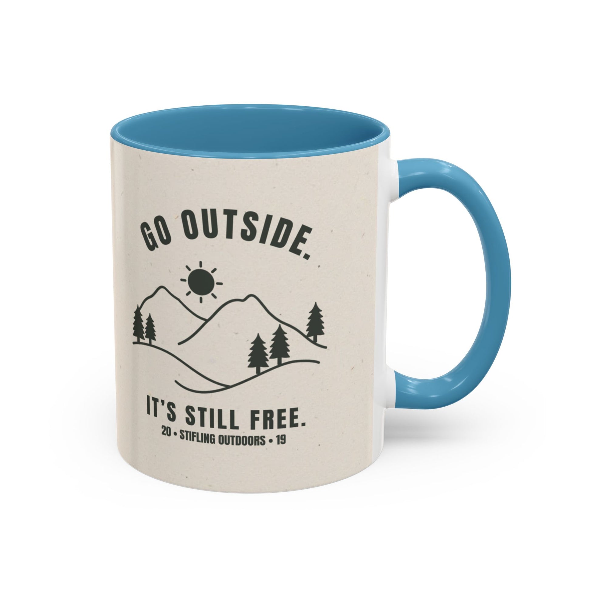 A coffee mug for those who love the outdoors. It says “Go Outside. It’s still free.” with a mountain silhouette. Perfect for nature enthusiasts and hikers. Ideal for daily use or as a gift for outdoor lovers.