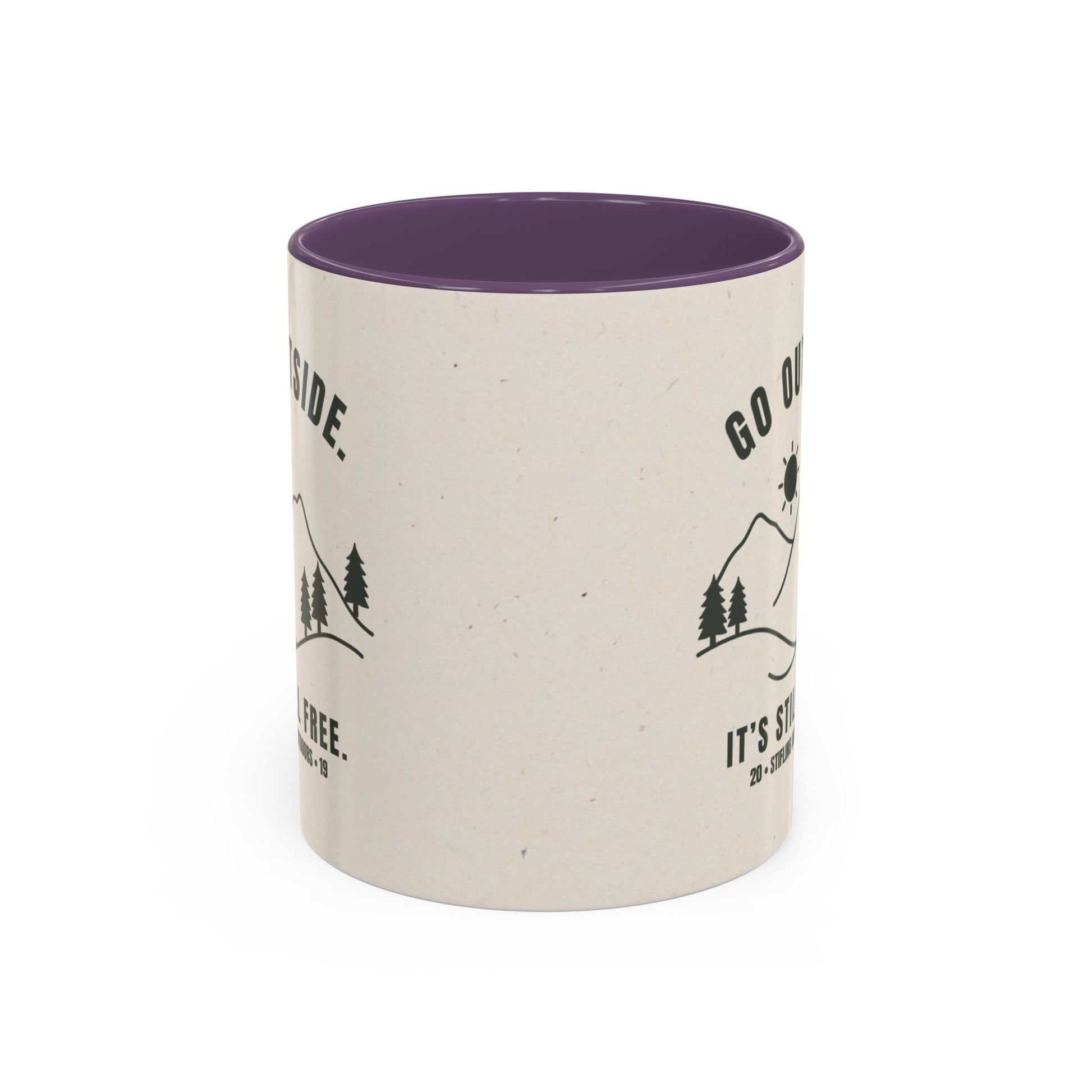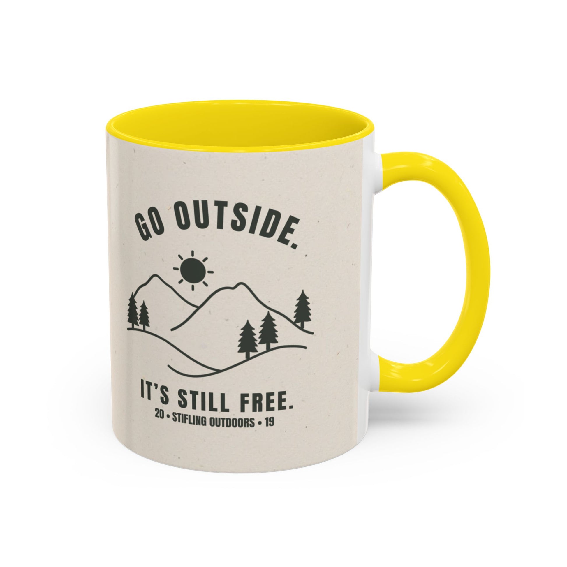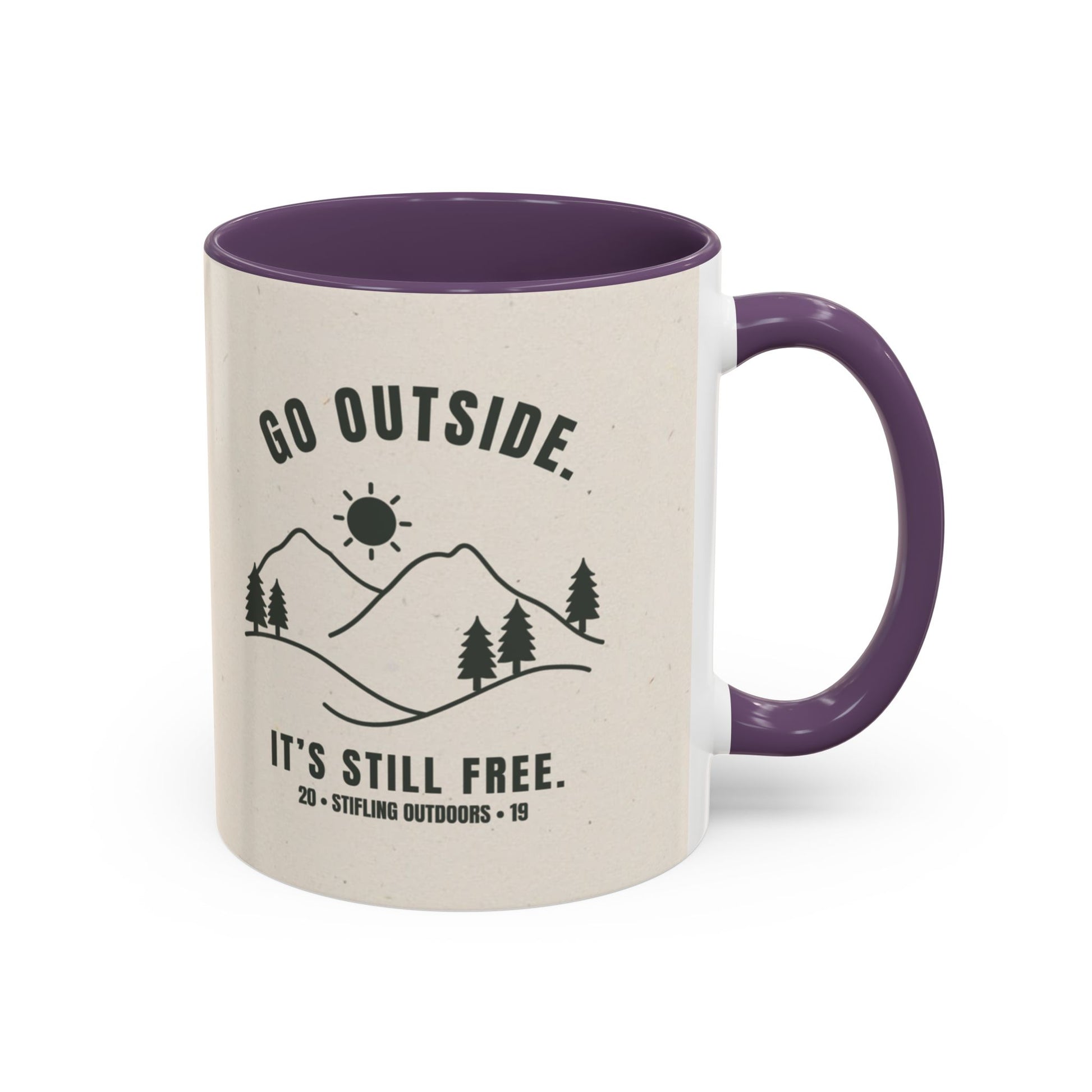 A coffee mug for those who love the outdoors. It says “Go Outside. It’s still free.” with a mountain silhouette. Perfect for nature enthusiasts and hikers. Ideal for daily use or as a gift for outdoor lovers.