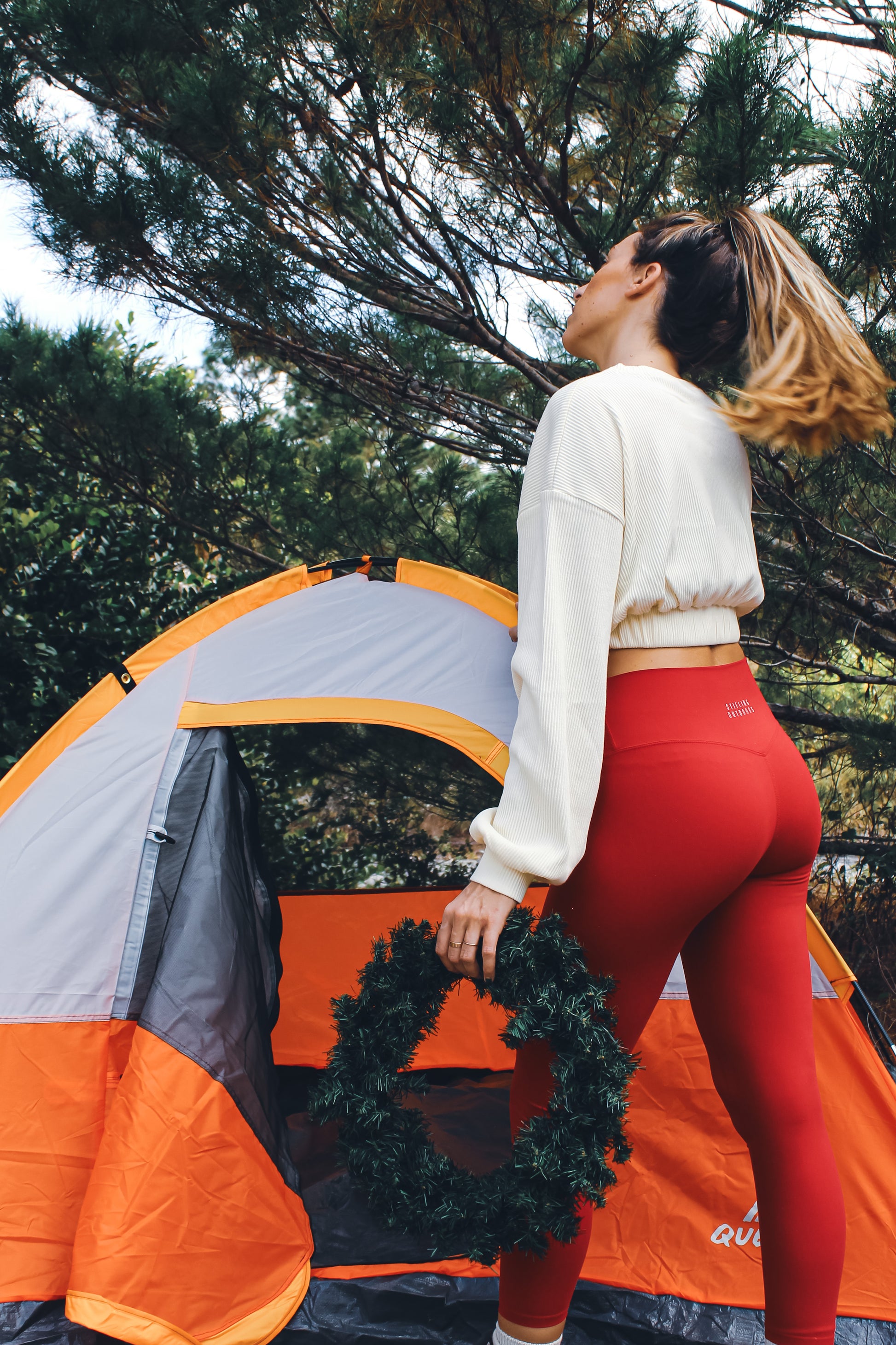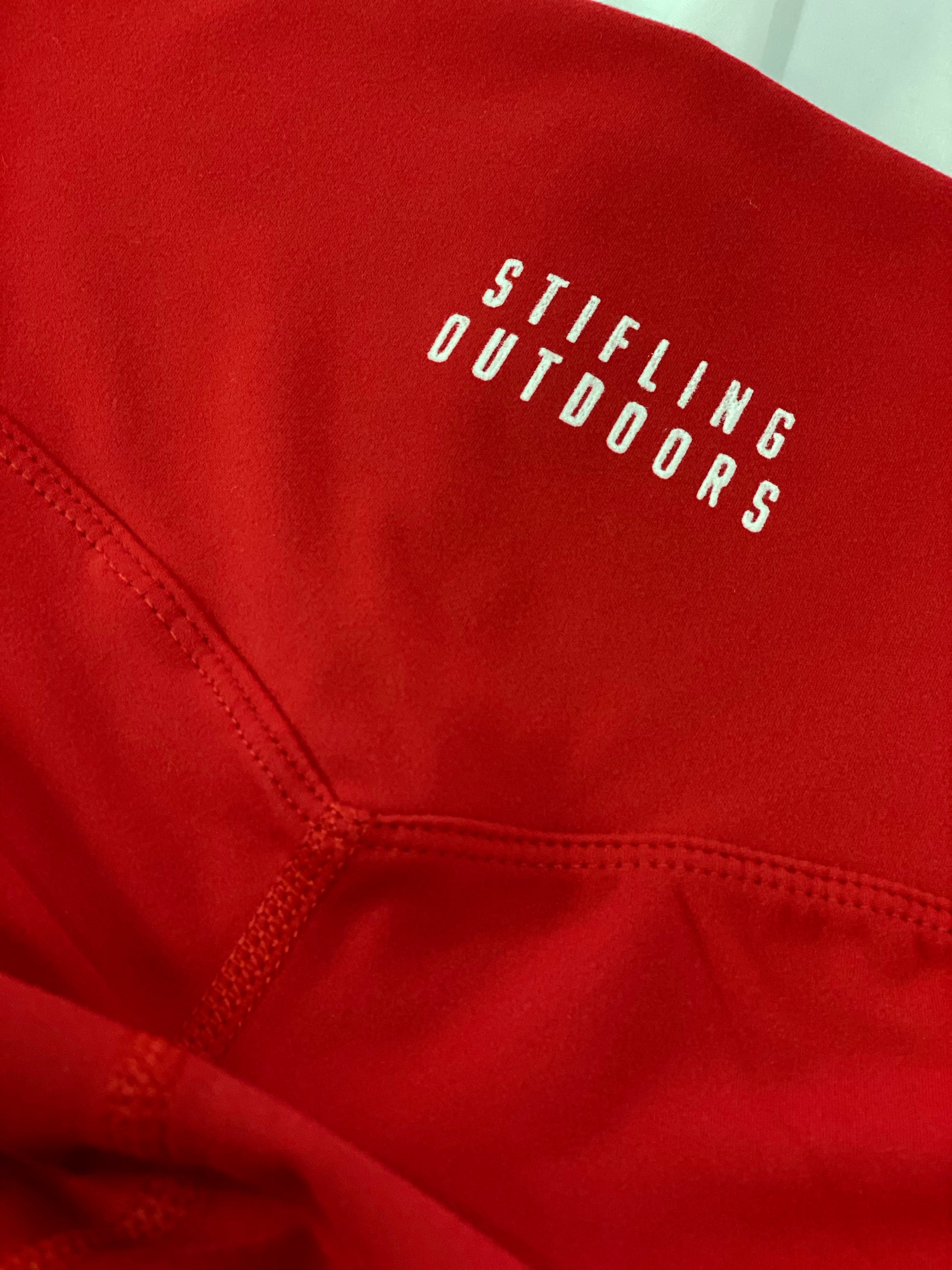 Shop for womens red leggings that are sure to stand out in the great outdoors. Butter Soft feel and great stretch. Squat proof and gym friendly. Deep V stitching in the back to accentuate your curves. Small logo detail on the back in white.