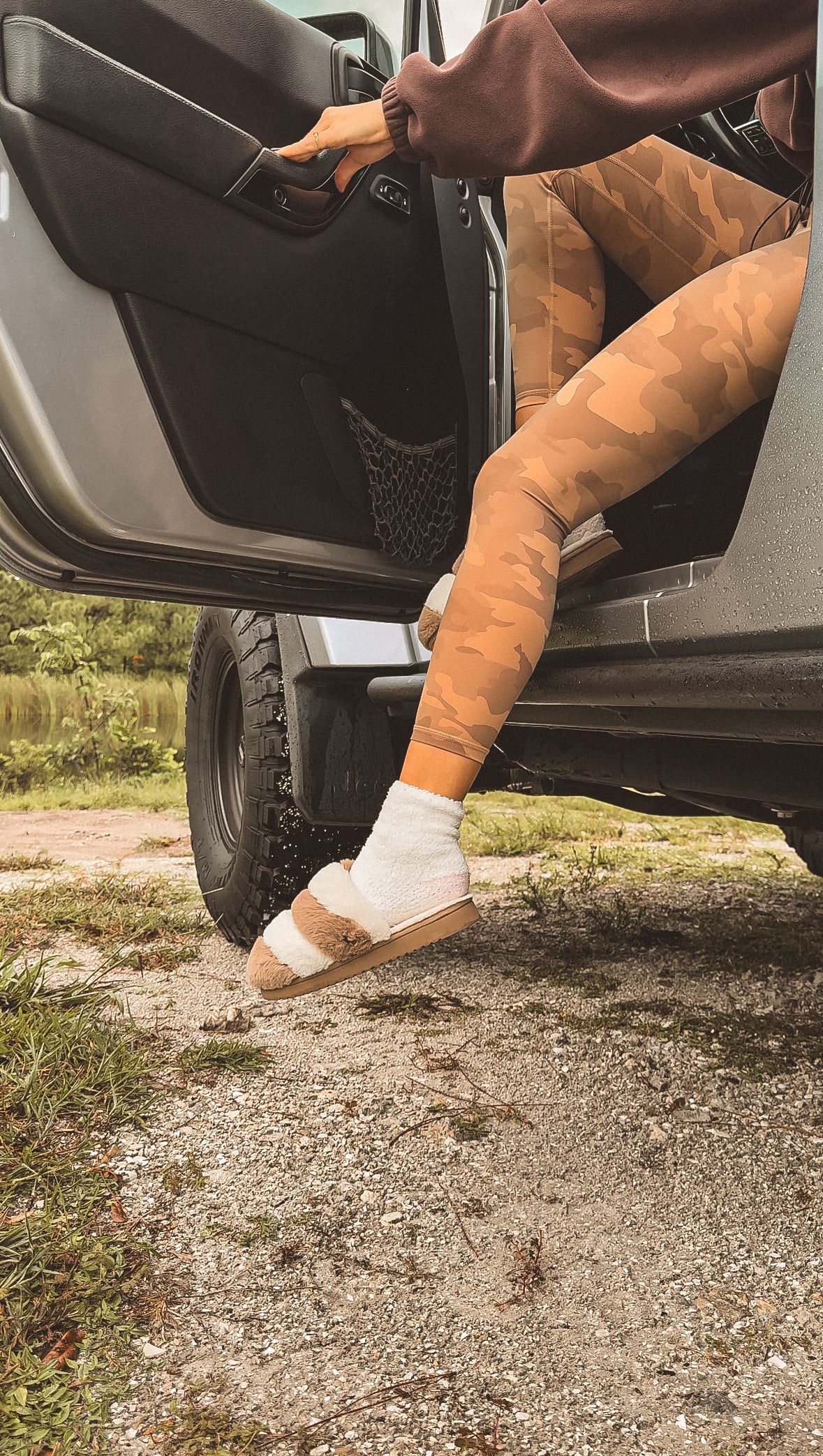 Women's leggings feature a neutral camo pattern. The White Stifling Outdoors Logo is displayed down the back with detailed stitching which subtly enhances the rear view. These leggings fall approximately just above the ankle.