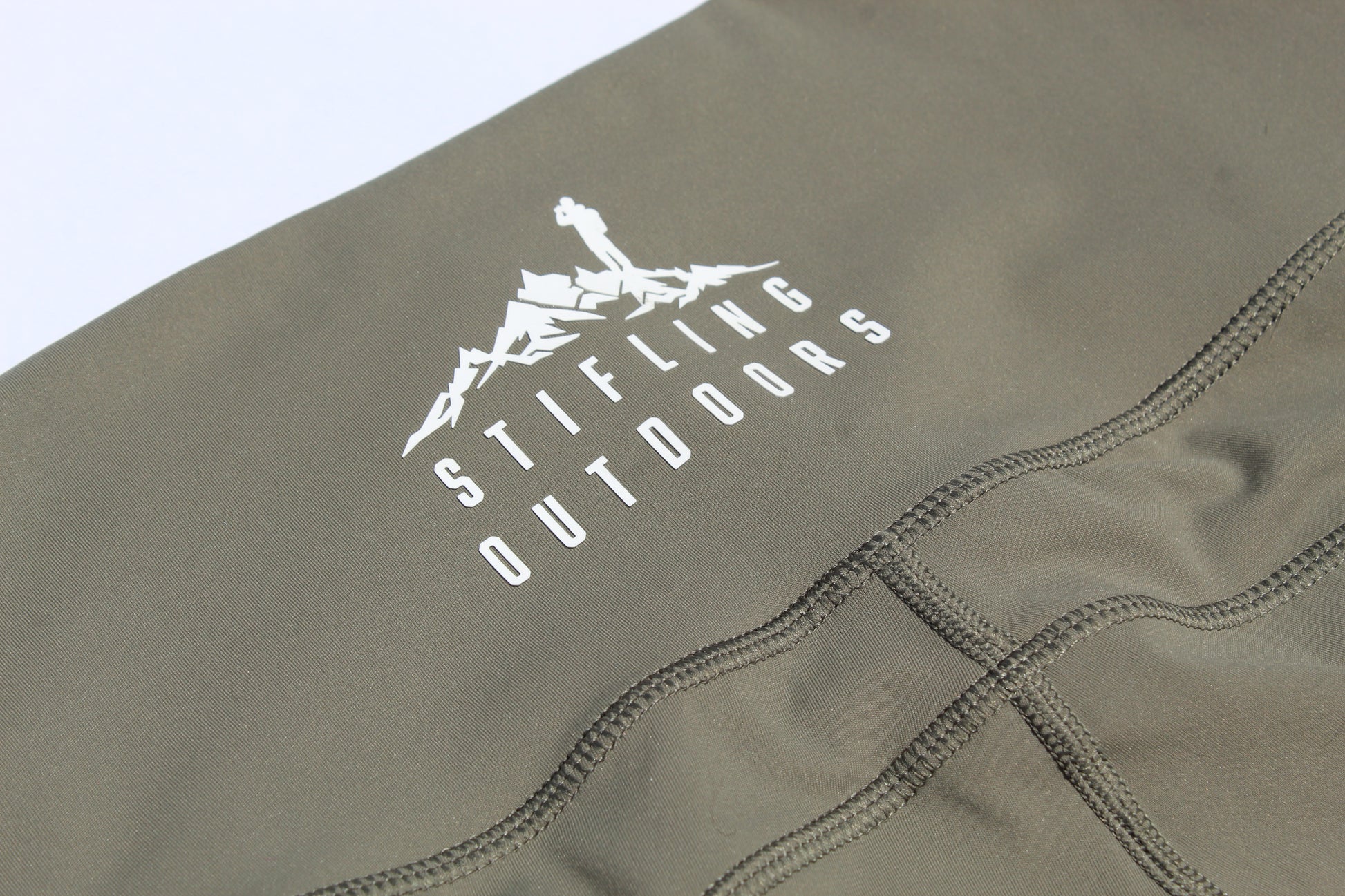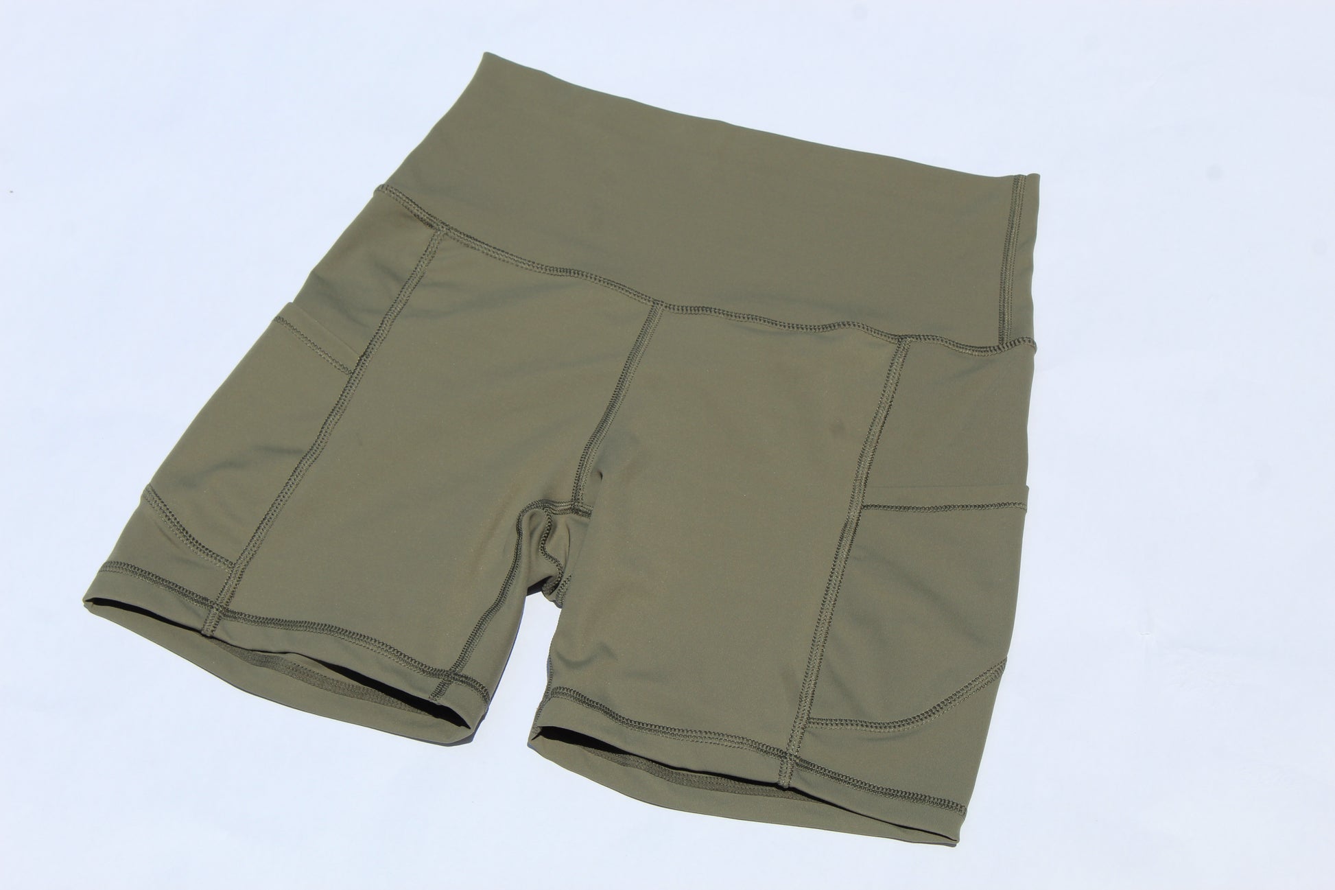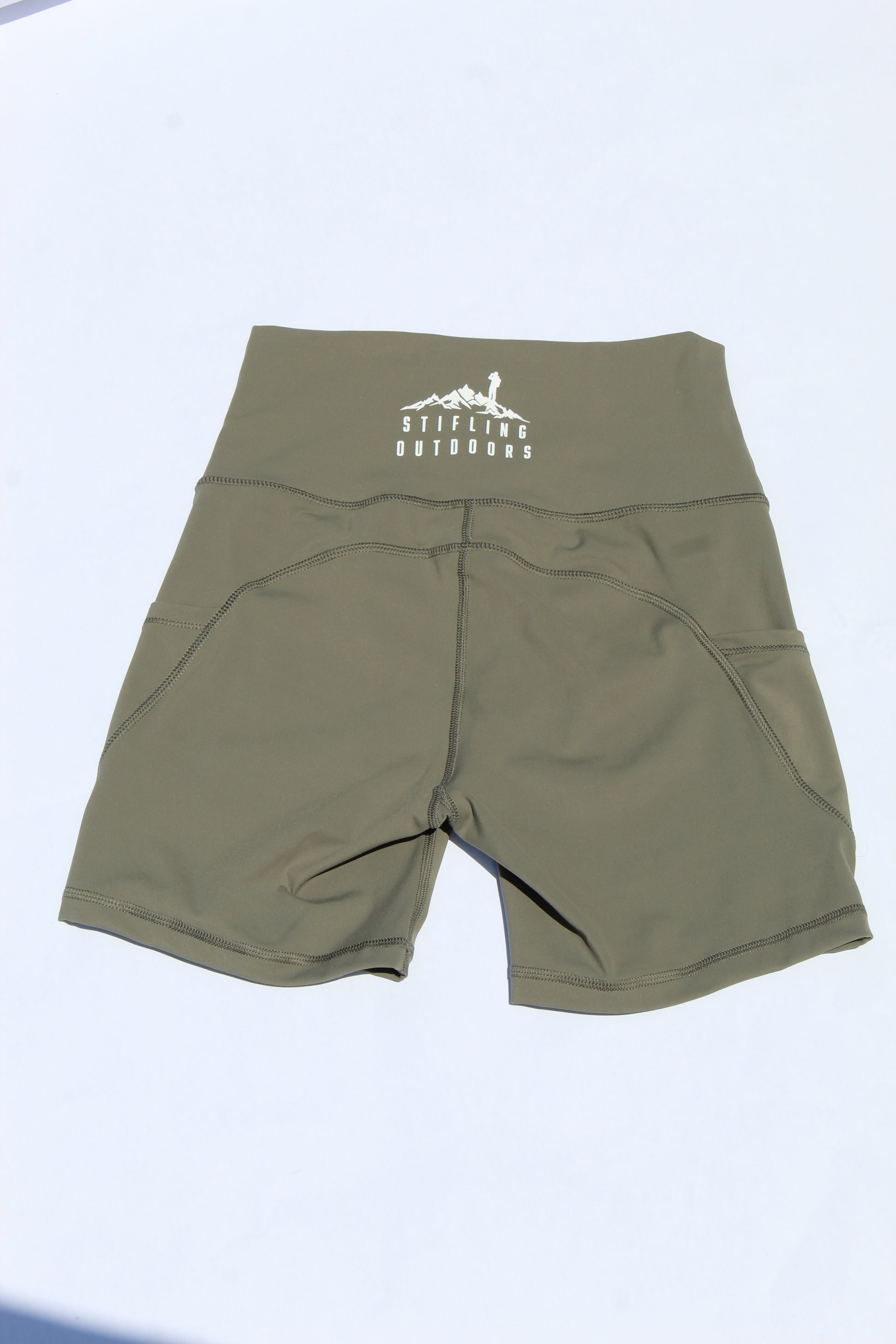 Shop for women's olive grey biker shorts. These shorts have pockets and are made with sweat-wicking material. The olive green/grey color is the perfect shade for winter, summer, fall, and spring. The Stifling Outdoors logo lets people know you're adventurous.