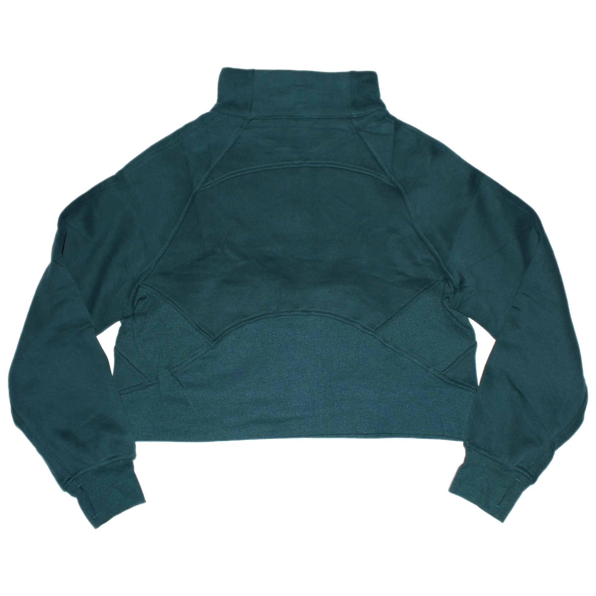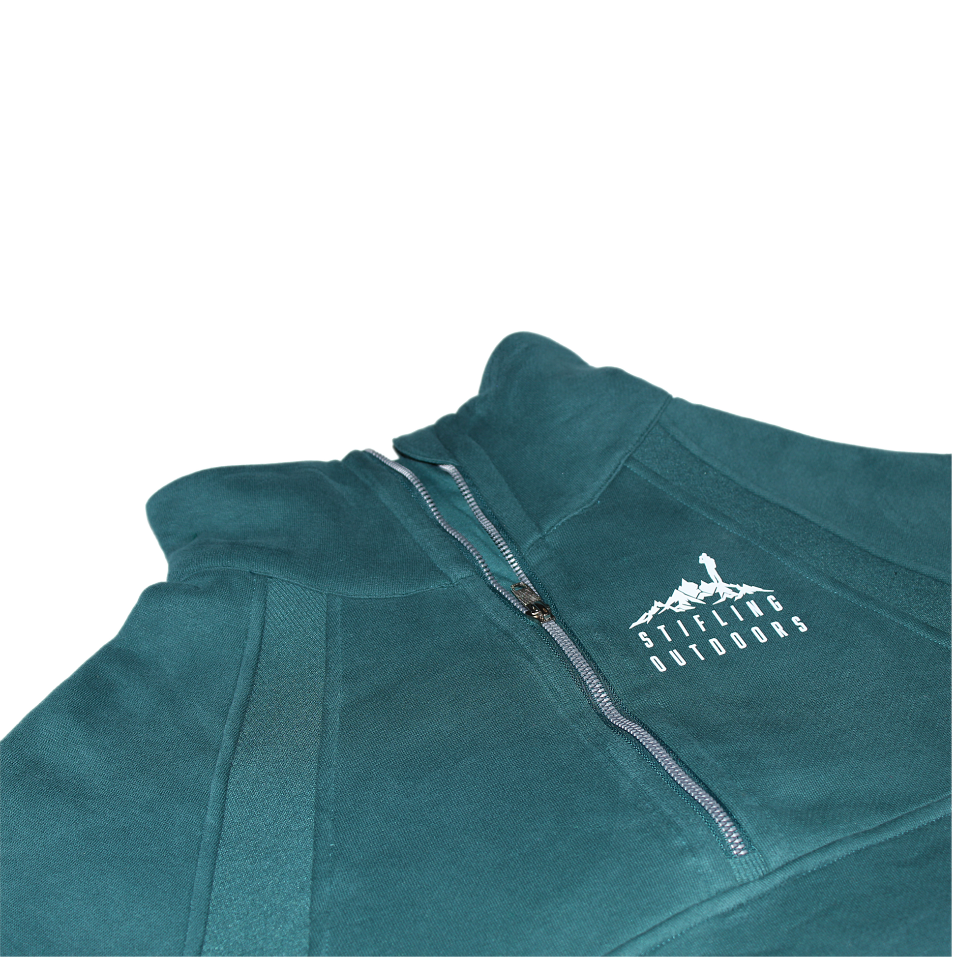 A quarter-zip pullover with a high collar, this piece features a teal hue and a soft fleece lining. High-quality stitching and detailed cuffs, plus a subtle white Stifling Outdoors logo on the left front side complete the look. Nylon/Poly Blend on the Outside